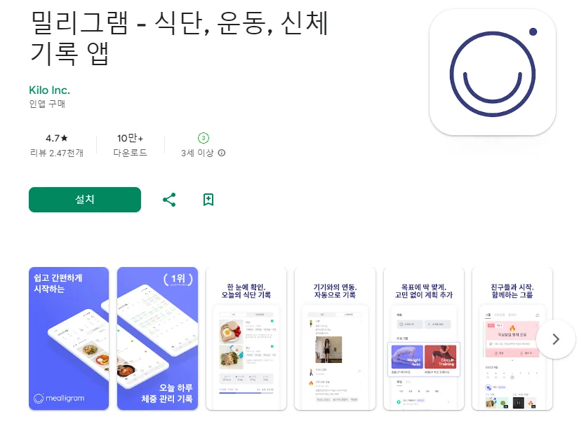 이 어플은 구글플레이스토어에서 "식단관리"로 검색했을때 5번째로 나오는 어플입니다. 아래는 밀리그램 - 식단, 운동, 신체 기록 앱 어플에 대한 자세한 설명이니 참고하세요.