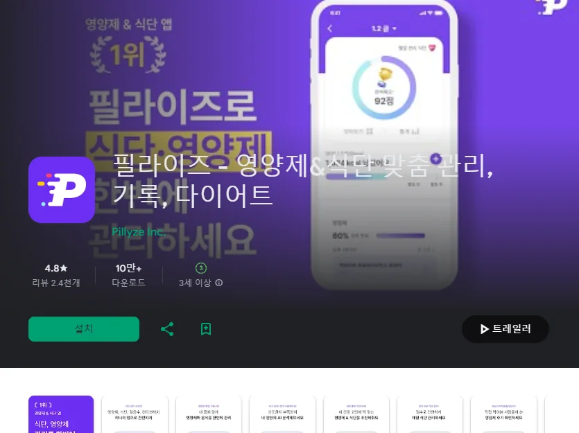 이 어플은 구글플레이스토어에서 "식단관리"로 검색했을때 2번째로 나오는 어플입니다. 아래는 필라이즈 - 영양제&식단 맞춤 관리, 기록, 다이어트 어플에 대한 자세한 설명이니 참고하세요.