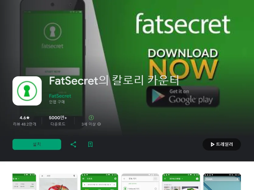 아래는 FatSecret의 칼로리 카운터 어플에 대한 스크린샷 정보입니다.