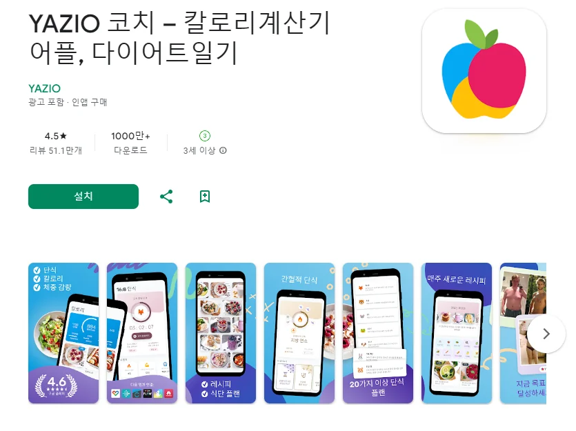 이 어플은 구글플레이스토어에서 "식단관리"로 검색했을때 4번째로 나오는 어플입니다. 아래는 YAZIO 코치 – 칼로리계산기 어플, 다이어트일기 어플에 대한 자세한 설명이니 참고하세요.