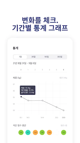 - 기간별로 내 몸무게가 어떻게 변화했는지 깔끔한 그래프와 통계로 정리해 드려요