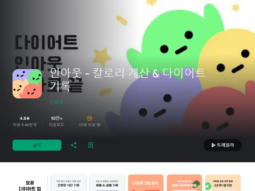 이 어플은 구글플레이스토어에서 "식단관리"로 검색했을때 1번째로 나오는 어플입니다. 아래는 인아웃 - 칼로리 계산 & 다이어트 기록 어플에 대한 자세한 설명이니 참고하세요.